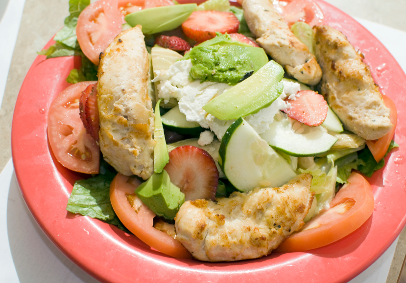Salad is a great way to add a lot of nutrients to your daily diet, and the protein in the chicken will keep you full until your next meal or snack. A salad with romaine lettuce, cucumber, tomato, onion, feta cheese and grilled chicken is even more delicious when you add avocado on top.