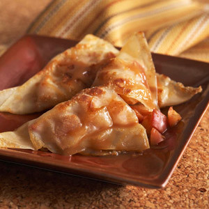 For each mini empanada, lay a wonton wrapper on a work surface with a point toward you. Spoon one-fourth of the apple mixture on the lower half of the wonton wrapper. Brush edges of wonton wrapper with water. Working carefully, fold the top point down to meet the bottom point, forming a triangle. Gently press the edges together to seal.