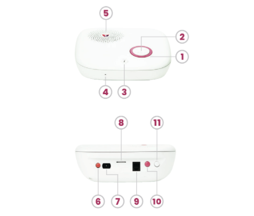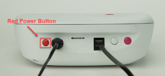 Plug the power adaptor into a direct wall socket that is not connected to a light switch. Press the red power button on the back of the device located next to the power cord. The info light will light up solid green indicating it is connected to a power source and will verbally state, “Device ready.”